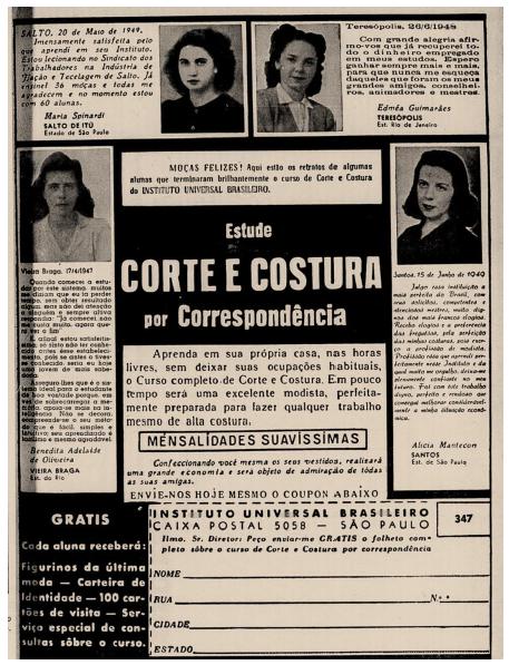Como um exemplo de propagandas, que tinham intuito de convencer as mulheres das vantagens em se estudar o corte e costura a distância, se destacam aquelas produzidas pelo Instituto Universal Brasileiro. Encontradas no Jornal das Moças, assim como em diversas revistas veiculadas no período, estas apresentavam cupons incluídos no fim da página que poderiam ser enviados pelos Correios de forma gratuita para maiores informações sobre o curso. Concomitantemente, como é possível ver na imagem a seguir, os anúncios publicitários da instituição visavam difundir a ideia de “Moças felizes” como aquelas que aprenderam o ofício de corte e costura, apresentando testemunhos de ex-alunas como incentivadoras das facilidades em se aprender o ofício.