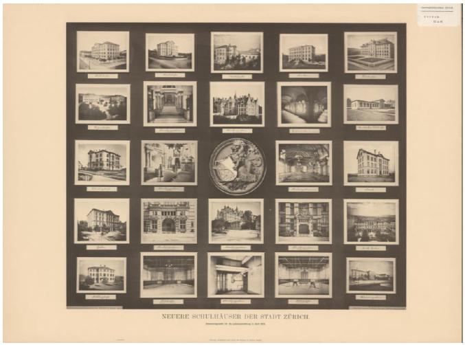 The general criteria “factual” and “pedagogic” applied also for school buildings. As factual criteria with regard of the school buildings may apply quality, hygienic and pedagogic standards which could be labelled as Swiss. Further, there is one element of the school buildings that helped the schoolhouse break through as a national Swiss feature: the heating and ventilation systems as products of the highest education institution in Switzerland, the ETH. Swiss engineers were internationally considered innovators of heating and ventilation systems applied in schoolhouses (HELFENBERGER, 2018). Thus, school buildings could represent the nation along the ETH, which was both product and motor of the modern Swiss state (GUGERLI et al., 2010). Parallel to the development of this “Swissness” in the international context, the cantons and even cities still emphasized their independence by highlighting their school buildings. On behalf of the national exhibition 1896 in Geneva for example, Zurich exposed a photographic poster of its most representative school buildings in Zurich City (Fig. 2). And local master masons published reviews on the newest communal or cantonal buildings (e. g. GEISER, 1901; NEUERE SCHULHAUSBAUTEN…, 1906).
