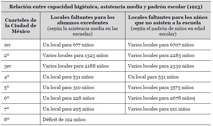 El informe redactado por Uribe y Troncoso nos da una idea tanto del número de alumnos que excedían la capacidad higiénica de los locales como de la falta de escuelas en la mayoría de los cuarteles de la ciudad de México. Ambos problemas fueron más graves en los cuarteles que abarcaban los barrios y colonias populares de la ciudad. En las escuelas del tercer cuartel (Santo Domingo, Lagunilla y Tlatelolco) hubo un excedente de 2188 alumnos, en tanto que en el segundo cuartel (Candelaria, La Viga y Jamaica) el excedente fue de 1323 estudiantes. Por otro lado, en los cuarteles primero (La Bolsa) y quinto (Santa María) faltaban escuelas para atender respectivamente a 6707 y 3573 niños, quienes según el padrón de niños en edad escolar no asistían a institución educativa alguna. Solamente en el octavo cuartel (Bucareli, Balderas, San Rafael y Chapultepec), una de las zonas menos pobladas de la ciudad y preferida por la clase media de la época, el número de alumnos no excedió la capacidad higiénica de las escuelas (INFORME SOBRE LA RELACIÓN…, 1913, p. 199-201).