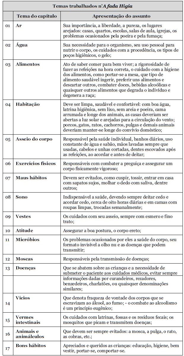 A primeira historieta, “A maior de todas as riquezas”, narra as cidades historicamente atacadas pelas epidemias que assolavam e dizimavam a população. É enfatizada a peste negra, a influenza espanhola, a falta de higiene como causadora desses males e a falta de conhecimento da população, que de forma inconsciente atribuía o caos a ira divina. A segunda história apresenta a fada Higia e seus predicados, seus ensinamentos, seu amor pelas crianças, sua luta por corpos perfeitos e saudáveis. A terceira história conta as travessuras dos irmãos Jeca e Tonico. Suas vidas mudam completamente após fugirem constantemente das aulas para sair vagando as ruas comendo frutas e tomando água imprópria. Resultado: enfermidade, medicamentos, sofrimento. A quarta história conta a visita feita pela fada a casa de Tonico e Jeca e a observação da sujeira que reinava naquele ambiente. Nesse ponto da narrativa, a fada da saúde adverte sobre a importância dos ambientes limpos, sem poeira, cheios de luz solar, arejados pelo vento, os cuidados com o ambiente onde se come e onde se dorme. Ensinou-os a higienizar o quintal que deveria estar livre do lixo. Limpar a casa era apresentado como sinônimo de combate aos insetos, parasitas, chupadores de sangue, hematófagos, dentre outros. A quinta história relata uma nova visita de Higia a casa de Jeca e Tonico. Dessa vez o diálogo é com a mãe das crianças. A personagem surpreendeu-se ao perceber a transformação que a casa havia passado após as orientações higiênicas dadas anteriormente. Fez novas inferências: sobre os alimentos, sobre a água, os cuidados com as verminoses e com as moscas; os cuidados com a mastigação, a digestão, o descanso após as refeições. A última história do manual didático coincide com a chegada do período natalino. A fada tratou de convidar as crianças para festejar o nascimento do Menino Jesus, a importância de ir à igreja, o cuidado com as roupas que deveriam ser limpas e leves durante o verão. A ceia natalina proposta pela fada Higia se tornou uma aula sobre indumentárias: qual o tipo de roupas adequadas para determinados ambientes, para o verão e para o inverno, roupas de dormir e de brincar, uniformes para a escola, os cuidados com as roupas de baixo, o uso de acessórios, dentre outros.