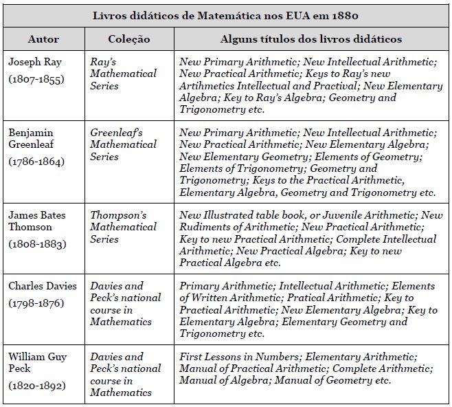 O apreço que ali se dá ao ensino dos números pode ser avaliado pelo avultado número de exemplares que ali há em circulação. O compêndio de Ray já está [na] MILÉSIMA edição; o de Greenleaf, no fim de seu livro diz que um milhão e seiscentos mil exemplares estão em circulação. Thomson, em 1875, publicou a sua 23ª edição. Davies, Peck e Venable estão sendo reimpressos constantemente (A PROVÍNCIA..., 1879, p. 2, grifo nosso).