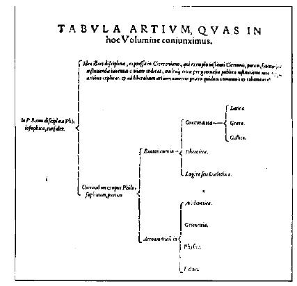 A necessidade de perceber os vários mecanismos que melhor representariam o conhecimento haveria, ainda, de conduzir Ramus a associar método com outro importante conceito, o de sistema. Foi de facto este que lhe permitiu concluir o seu propósito de conceber a educação formal num quadro de eficiência e perfeição natural, até então sem quaisquer precedentes. Não bastaria apenas submeter o infinito do discurso aos princípios da ordem e da complexidade crescente; Ramus especializou-se igualmente nas dicotomias, na distribuição e na disposição, assim como em outras operações diagramáticas que iriam reduzir todo o conhecimento a modelos espaciais bifurcados, a uma taxonomia de tipo arborescente. Os mapas que foi dispondo no interior dos seus manuais constituem uma espécie de telescópio que permitia enxergar de um só lance uma qualquer totalidade, sendo por isso o melhor meio que encontrou para estandardizar, planificar e distribuir os conteúdos da aprendizagem. Dessa forma, deu corpo a um movimento no sentido de que todo o pensamento - e não apenas o do universo - pudesse ser estruturado em modelos espaciais apreendidos pela visão. Imaginou cada arte, gramática incluída, como se fosse um sistema axiomático firmemente organizado. Havemos de reconhecer, outrossim, que os caboucos da teoria curricular contemporânea, e bem assim muitos procedimentos das chamadas boas práticas educativas, estavam já inteiramente supostos na estrutura diagramática proposta por Ramus. Não por acaso, uma das raríssimas aparições do termo currículo ocorreu na versão Professio Regia - publicada como obra póstuma por Thomas Fregius em Basileia no ano de 1576 -, numa Tábua das Artes (Fig. 1), em referência à disciplina de filosofia.