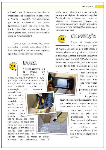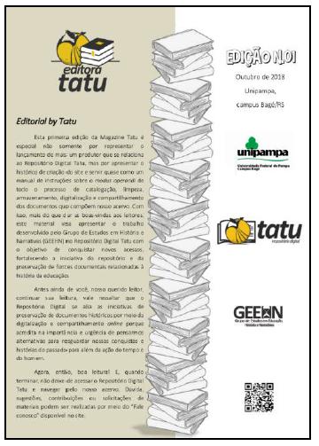 Neste sentido, como diz o editorial da Tatu Magazine, a primeira edição da revista contém o modus operandi do Repositório Digital Tatu, aproximando-se de um manual de instruções sobre o trabalho que, a partir da Tatu Magazine, torna-se disponível de ser replicado por outros grupos interessados em juntar-se aos esforços pela preservação e divulgação de acervos por meio da internet.