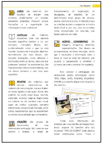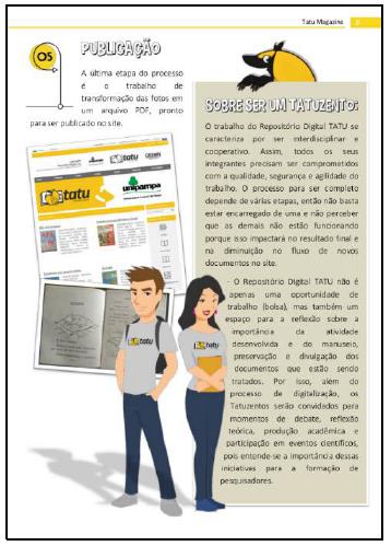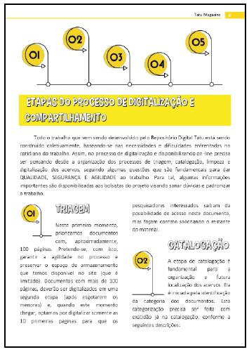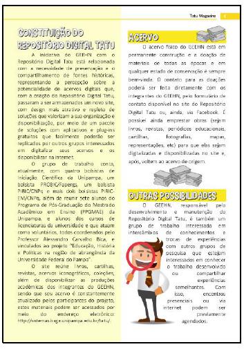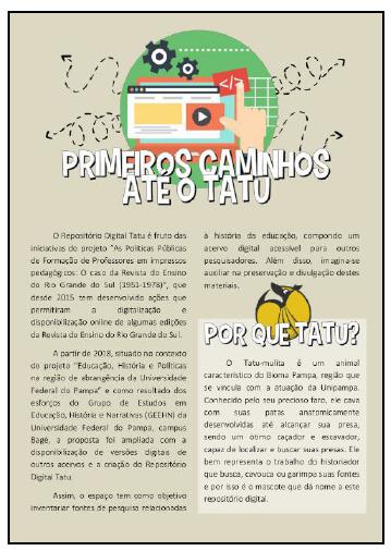 Assim, a Tatu Magazine pode ser entendida como um manual para consultas, com informações básicas e o histórico do site para que, tanto os bolsistas que integram o projeto, como outros pesquisadores interessados em entender a lógica do funcionamento do Repositório Digital Tatu, possam consultar e ter acesso ao detalhamento sobre do trabalho desenvolvido. Na concepção do material, além do conteúdo, que considera pressupostos sobre o manuseio e problematização de fontes documentais relacionadas à história da educação, foram considerados aspectos relacionados com a concepção visual, uma vez que havia a intenção de produzir um material atrativo e de design amigável, seguindo a lógica e proposta do Repositório Digital Tatu. Também considera-se que a Tatu Magazine é uma revista digital e, por isso, sua produção considera concepções necessárias em um material de comunicação e que possui um público leitor.
