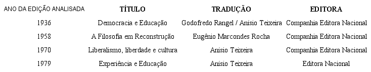 Deste modo, considerou-se fundamentais a abordagem e o tratamento de algumas das obras de Dewey, conforme apresentadas no Quadro 1, como esforço de entendimento de suas principais categorias teóricas, voltadas especificamente para a compreensão de ideias como Educação, Sociedade e Democracia.
