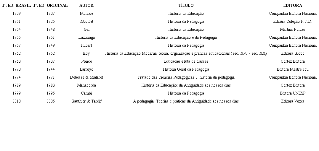 Os referidos manuais (ver Quadro 2, abaixo) de História da Educação e/ou Pedagogia são de autoria estrangeira (europeus e americanos), traduzidos para a Língua Portuguesa, e os quais tiveram ou têm intensa circulação no Brasil em cursos de formação de professores, seja em escolas normais ou em cursos de graduação / pós-graduação, a partir de levantamentos anteriores, que demonstraram a presença de tais manuais em planos de cursos e/ou bibliotecas das instituições escolares investigadas.