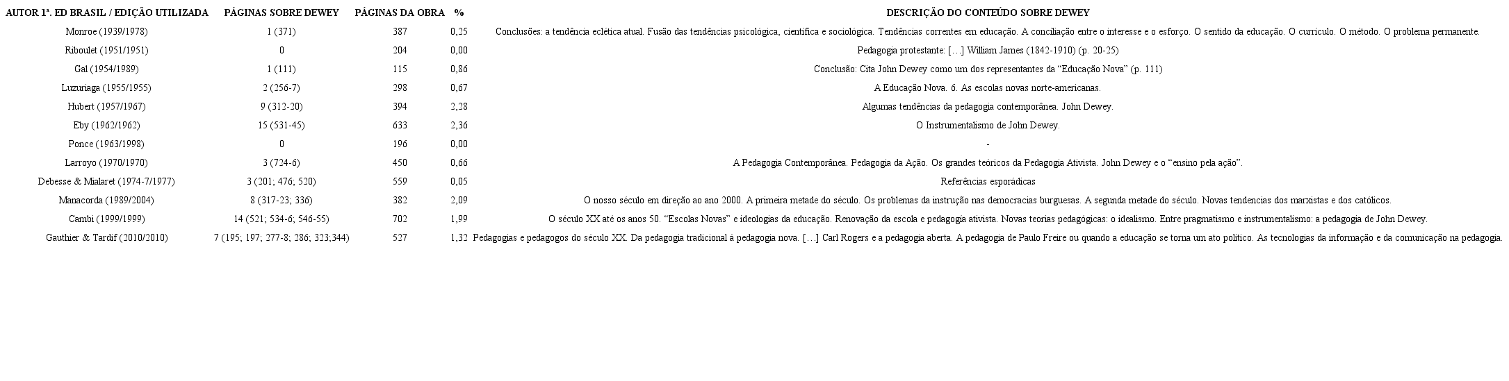 Com base na análise de conteúdo programático, desenvolver-se-á nos próximos subtópicos uma descrição pormenorizada das ocorrências textuais e discursivas em torno de Dewey nos manuais de História da Educação e/ou Pedagogia mencionados anteriormente.