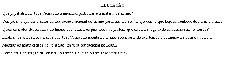 Ainda no seu tempo do Pará nota-se uma outra obra de José Veríssimo que, em meio menos distraído e de leitores menos apressados, mesmo hoje, a sua repercussão seria diferente: trata-se do livro A Educação Nacional, que êle publicou em 1891, no mesmo ano que se muda para o Rio (MONTENEGRO, 1958, p. 8 - grifo do autor).
