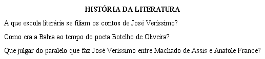 Curiosamente, a despeito de a antologia selecionar textos de caráter literário da obra de José Veríssimo, as perguntas do “questionário” centraram-se basicamente em temas educacionais e de sociologia/história do Brasil - observar nos Quadros 1, 2 e 3 a seguir.