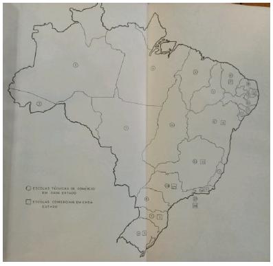 O documento ‘Estabelecimentos de Ensino Comercial Existentes no Brasil - 1946’2,consiste em uma publicação do Ministério da Educação e Saúde Pública e do Instituto Nacional de Estudos Pedagógicos, do ano de 1946. Ao longo de 44 páginas, o documento apresenta o rol de Escolas Técnicas de Comércio e Escolas Comerciais existentes em cada estado brasileiro. Inicialmente, tem-se um mapa político do Brasil contendo o número de instituições por estado. Na sequência, são apresentadas duas tabelas. A primeira traz o número de Escolas Técnicas de Comércio (375) e de Escolas Comerciais do Brasil (75) que, juntas, somam um total de 450.