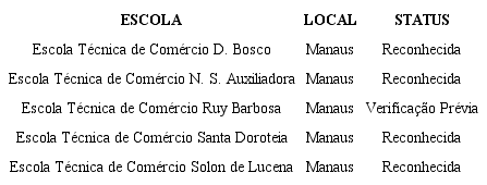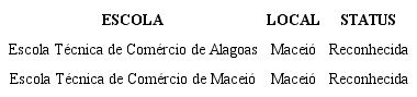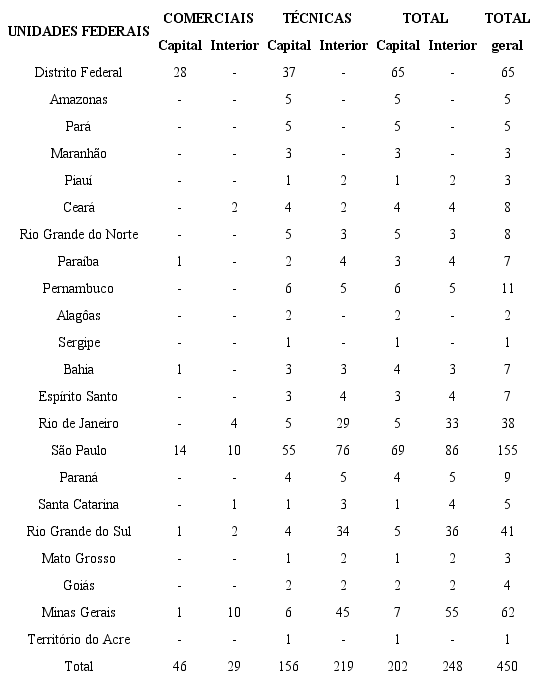 A segunda tabela apresenta uma relação do número de escolas comerciais e técnicas por unidades da federação, distribuídas entre capital e interior. Dessa forma, é possível afirmar que, em 1946, a maior quantidade de instituições comerciais encontram-se em São Paulo, Distrito Federal (Rio de Janeiro) e Minas Gerais, respectivamente 165, 65 e 62. Em contrapartida, o menor número de instituições localizam-se em Alagoas (2) e em Sergipe e Território do Acre, com uma instituição cada. Considerando o espaço de atuação dos profissionais formados nas escolas comerciais, o documento oferece dados para além da pesquisa Histórico Educativa, permitindo dialogar com a História Econômica e Social.