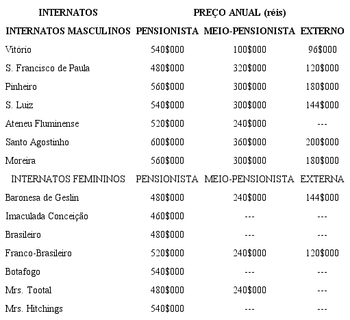 Os valores apresentados no quadro anterior incluíam, em qualquer das três condições, para as meninas, o ensino de primeiras letras e “trabalhos manuais”3 e, para os meninos, o ensino de primeiras letras ou disciplinas do ensino secundário. A principal diferença entre o valor das pensões entre internatos masculinos e femininos era basicamente o ensino secundário ou as matérias preparatórias para as faculdades, oferecidas somente nos primeiros e, neste caso, elevando o valor da pensão. Igualmente, observa-se que a diferença entre um aluno pensionista e um meio-pensionista, em alguns colégios, podia ser quase cinco vezes maior do que o valor daquele em relação a este. A diferença de preço das pensões entre os internatos masculinos podia chegar a 120$000 réis anuais, e nos internatos femininos esse valor chegava a 80$000 réis.