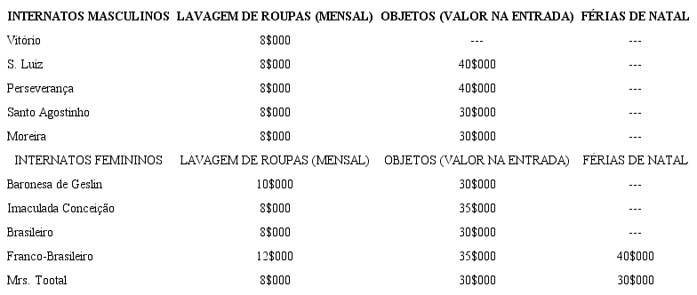 No valor da pensão dos internos (pensionistas) não estavam incluídos determinados serviços e/ou bens costumeiramente disponibilizados pelos internatos. Assim, eram pagos em separado quantia para o uso de alguns utensílios, os serviços de lavagem e gomagem de roupas, eventuais gastos com médico e remédio e as férias passadas no internato para estudantes que, principalmente por motivo de distância, não podiam retornar para suas casas. Em seguida, na Tabela 2, são apresentados os preços cobrados por alguns colégios-internatos para os serviços citados.