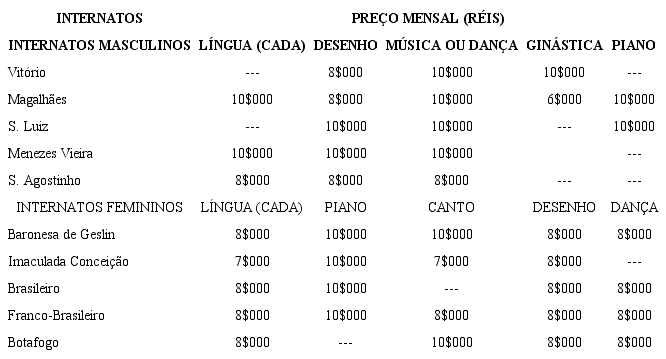 As atividades complementares de ensino - denominadas nos anúncios e/ou prospectos de “belas-artes” ou “artes de recreio” - eram opcionais e pagas em separado. A Tabela 3 em sequência apresenta valores das “artes de recreio” e o estudo de línguas não compreendidas na pensão de internatos estabelecidos no Rio de Janeiro.