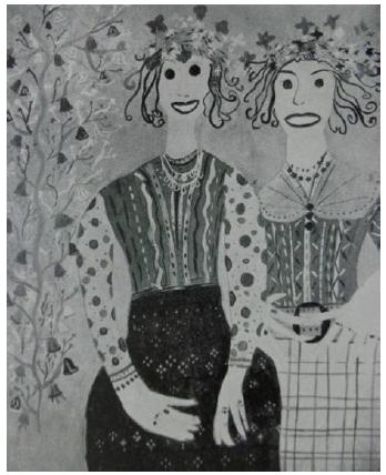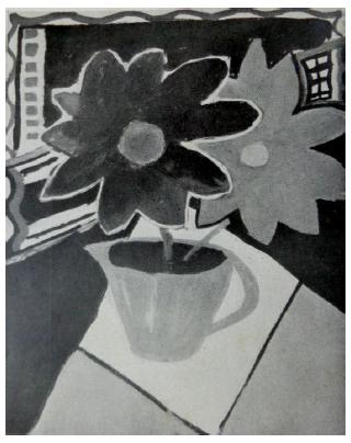 Com relação às faixas etárias a distribuição foi desigual, tendo os adolescentes entre 12 e 17 anos representado quase dois terços do total de participantes. As crianças menores, entre 3 e 6 anos, cuja liberdade de expressão era tão louvada nos discursos modernos sobre o desenho infantil, perfizeram pouco mais de dez por cento do total, sendo que cerca de um quarto dos meninos e meninas participantes estava na faixa entre 7 e 11 anos. Um total 8 trabalhos foram reproduzidos em monocromia, o que de certa forma limita a análise da produção dos participantes, pois um dos elementos mais destacados nos depoimentos dos visitantes foi a riqueza cromática. Essas imagens abordam, em geral, temas ligados ao cotidiano infantil, tais como figuras humanas de corpo inteiro, animais de estimação, personagens como a florista, a mãe passeando com o bebê, figuras em trajes folclóricos (Imagem 2) ou grupos familiares. Também foram escolhidas cenas de zoológico com animais como tigres e leões marinhos, caçadas e cavalos selvagens. O universo da arte não se encontrava ausente na seleção que privilegiou, igualmente, gêneros pictóricos tradicionais como o retrato, a natureza morta (Imagem 03) ou a paisagem (BRITISH COUNCIL, 1941-1942a).