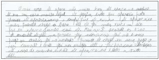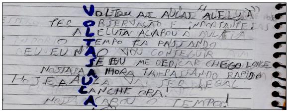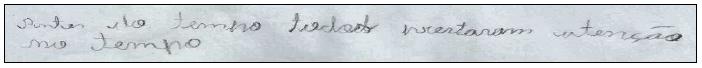 Poderia a escola operar na lidação com as práticas de escrita e leitura atenta à lidação com o tempo, no sentido de justamente encontrar furos no texto, não para denunciar a falta de consistência, mas para respirar entre eles? A partir disso, trago alguns excertos dos cadernos examinados para fazer um rabisco na areia, marcando uma história, mas fazendo-o no papel, porque há algum desejo maior de duração. Assim, estabeleci alguns deslocamentos em se tratando das relações narradas pelas crianças nos cadernos com o tempo.