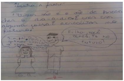 Já em um caderno de 1973, uma menina da 2ª série completa uma atividade que solicitava “Escrever, nos quadrinhos, alguma coisa que fazes”. O quadrinho é dividido em manhã e noite. A menina descreve que toma seu tempo com estudo, brincadeira, alimentação, sono e televisão. Já em 1995, aparece descrita uma infância que vai ser alguma coisa, como promessa de futuro, sendo a relação com o tempo fortemente pautada pelo futuro (esse é enunciado bastante regular nos cadernos examinados).