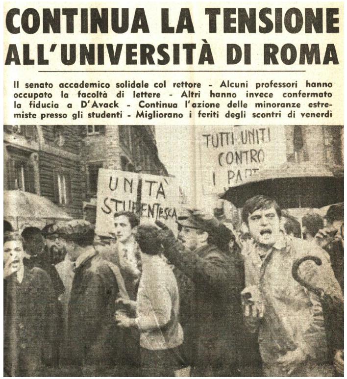 Las palabras del parlamentario Rosati llevan al segundo punto, un topos relevante y ampliamente tratado en las columnas del Corriere: en perfecta sincronía con el farragoso debate del “dos pi griego”, se iba montando rápidamente la protesta estudiantil en los recintos universitarios y en las calles y plazas. La aceleración de los acontecimientos resultaba evidente, y hacía temer desórdenes aún más catastróficos.