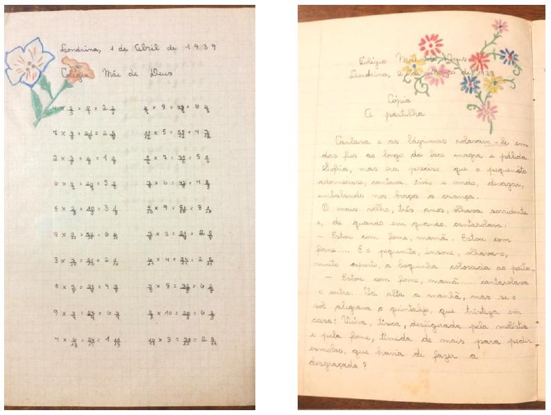 No caso do arquivo em tela, as condições adequadas de acondicionamento permitiram a constituição de um acervo. Nas nossas incursões pelas caixas que acomodam o material, encontraram-se, entre outras coisas, vários cadernos de diferentes disciplinas e épocas. Dois cadernos da quarta série primária chamam a atenção pelo cuidado demonstrado em seu trato e manuseio, visto estarem em perfeitas condições passados 76 anos, um de aritmética e outro português (cópia), datados de 1939. Ambos são adornados com flores desenhadas e pintadas nas extremidades das folhas preenchidas com caligrafia perfeita, com assuntos dessas matérias, conforme mostram os exemplos das fotografias a seguir (Fig. 01). Cada uma das folhas dos cadernos tem um desenho diferente. A aluna autora dos desenhos e dos registros, a primeira a ser matriculada no Colégio, está viva e saudável até a presente data.