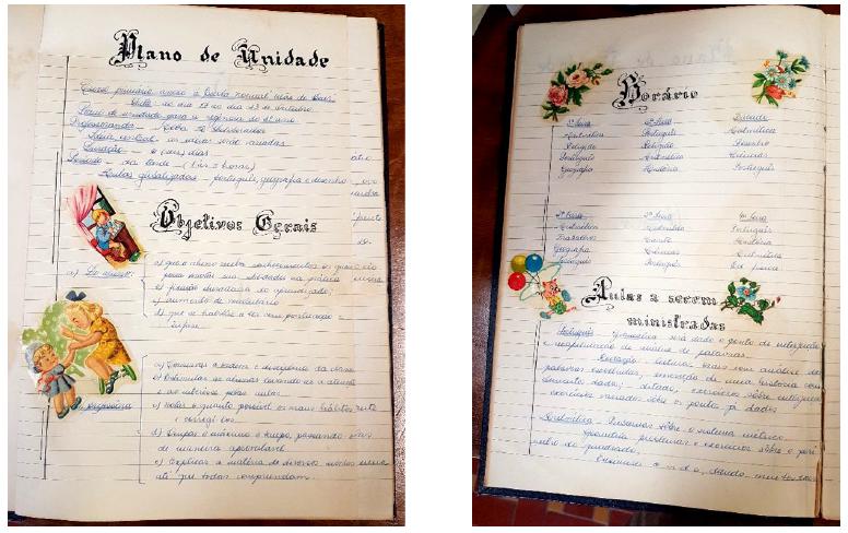 Há também no acervo do Colégio Mãe de Deus, os “Planos de Unidade”. Esses são registros detalhados de todos os passos programados para regência de classe das alunas do Curso Normal. Os “Planos de Unidades” aparecem em 1957 e este exemplo que se trouxe aqui - conforme mostram as fotografias a seguir (Fig. 02) - foi planejado por Alba A. Deliberador, “professoranda” da 2ª turma de Normalistas deste mesmo ano, para ser aplicado com as crianças da própria escola. Pode-se descrever como um “plano de trabalho” no qual toda a semana fora previamente programada, cada dia, de segunda-feira a sábado, de 17 a 23 de outubro. No dia 23, sábado, na última aula projetada pela estudante Alba Deliberador, esta ministrará as seguintes matérias: Aritmética, Desenho, Ciências e Português.