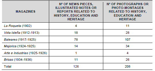 As seen in Table 01, a total of 126 news pieces or notes, reports, adverts, etc. with photographs related to history, education and heritage were found in all illustrated magazines correlating to a news magazine model from the analysed period, with the total number of inventoried and analysed photographs standing at 208.