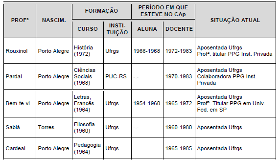 O distanciamento temporal entre o vivido e o recordado, fica mais evidente se atentarmos para o fato de que nenhuma das professoras está mais vinculada ao quadro funcional do CAp. Bem-te-vi foi a primeira a tomar outros rumos na profissão, deixou o Colégio na década de 1970, mas permaneceu ligada à Ufrgs pela Faculdade de Educação, onde esteve até o desligamento total nos anos 1980. As demais, que estavam vinculadas ao CAp e Faced simultaneamente, se afastaram primeiro do Colégio, ao longo dos anos 1980, para se dedicarem exclusivamente à Faculdade de Educação, onde permaneceram até a década seguinte.