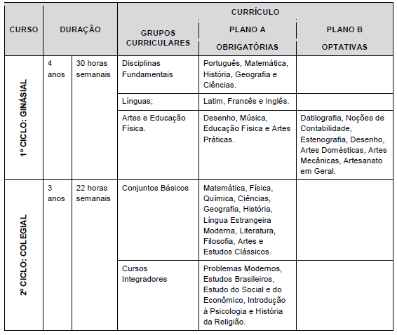 Em tese, o currículo foi idealizado para que o estudante desenvolvesse uma relativa autonomia, guiado pelo Serviço de Orientação Educacional e pela família. O Plano A direcionava para uma formação humanística, destinada àqueles que desejavam prosseguir no segundo ciclo do Ensino Secundário “nas Escolas Normais e em outros estabelecimentos que exijam essa forma de preparo propedêutico”. (PACHECO, 1961, p.2). Já, o Plano B, que previa disciplinas como Noções de Contabilidade e Artes Mecânicas, voltava-se para “atender às vocações de caráter prático e a necessidade de trabalho”. (PACHECO, 1961, p.2) dos jovens que talvez não seguissem imediatamente o segundo ciclo Secundário. Havia, neste caso, a preocupação de que o estudante fosse devidamente instrumentalizado para seguir atividades comerciais, artísticas ou industriais, a fim de qualificar de forma especializada a mão de obra que atenderia à demanda do mercado de trabalho.