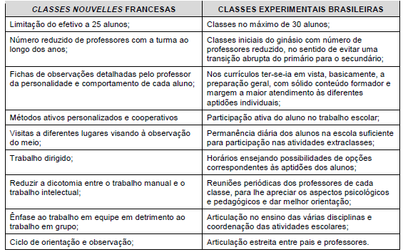 Portanto, no intuito de alcançar o sucesso das Classes Experimentais no CAp, foi necessário que o corpo docente conhecesse as características das Classes Nouvelles francesas, no sentido de aperfeiçoar a experiência a ser realizada. Os princípios e métodos adotados pelo Colégio de Aplicação tendiam a ser uma mescla da normatização francesa e brasileira, observadas no próximo quadro que apresenta características dos dois enfoques.