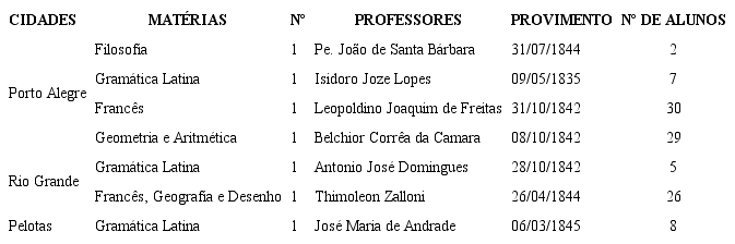 No que tange à oferta de ensino secundário de caráter público, a situação não era diferente. Em 23 de março de 1836, o Vice-Presidente da Província, Américo Cabral de Melo, sancionou a seguinte lei: “Art. Único - Estabelecer-se-á na cidade do Rio Grande uma cadeira de gramática da Língua Francesa e seu professor vencerá o ordenado anual de 400$000 réis” (DECRETO, 183611). Após a Revolução Farroupilha, a situação do ensino secundário na Província encontrava-se da seguinte forma (Quadro 1):
