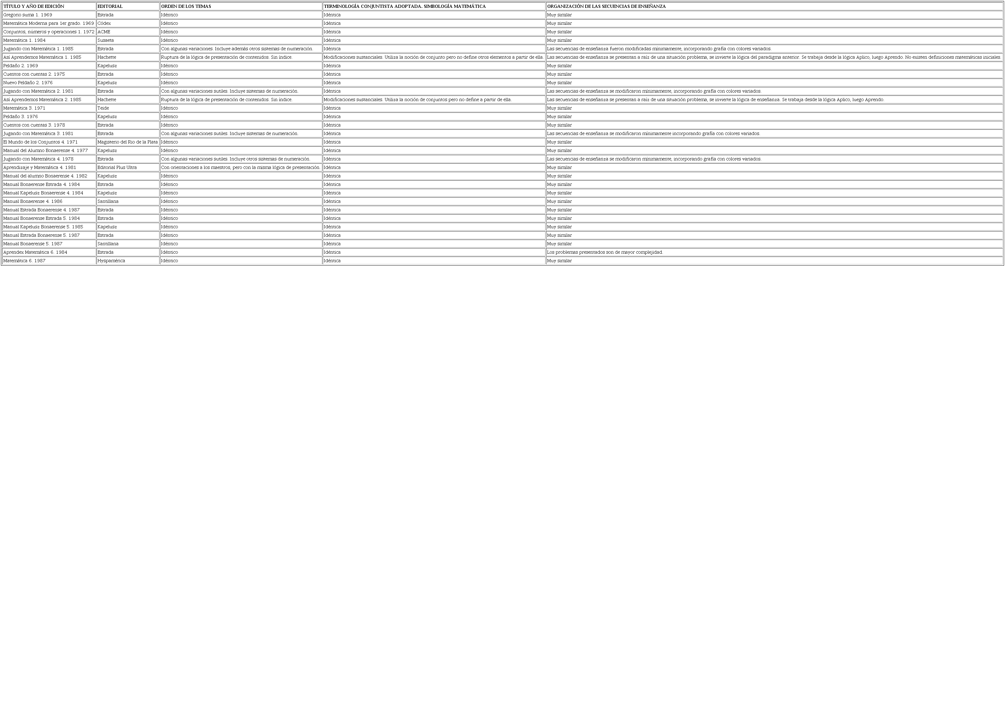 En un segundo momento, como recorte del problema de investigación, se analizaron los capítulos de los libros que tratasen los temas de iniciación a la numeración y las cuatro operaciones. Del análisis fue posible inferir que la metodología de trabajo y los temas centrales se repetían, independientemente que fuesen de diferentes autores, ediciones, o editoriales, iniciando a los niños en matemática, en todos los casos, desde la lógica conjuntista. En el Cuadro 1 se expone un resumen de las unidades de análisis (orden de los temas, la terminología y simbología adoptada y la organización de las secuencias de enseñanza), correspondientes a los primeros seis años de la enseñanza primaria.