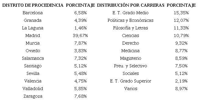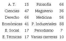 Los estudiantes voluntarios de 1963 cursaban estudios en universidades de diferentes ciudades de España (Tabla 1), principalmente en Granada (31), Madrid (205), Oviedo (41), Santiago de Compostela (40) y Zaragoza (45), siendo su distribución la que refleja la tabla que se presenta a continuación (SUT, 1963, p. 105). La clasificación respecto a la carrera que estudiaban (Tabla 2) muestra que predominaban estudiantes de Ciencias (47), de Derecho (66), de Económicas (41), de Filosofía (66), de Medicina (56) y de Industriales (88) (SUT, 1964, p. 115). Por su parte, la CEP de 1964, arroja unas cifras de participación más altas que las del año precedente con 547 universitarios. En esta ocasión la geografía de intervención se ubicó en Galicia, concretamente en las provincias de Orense6 y Pontevedra7. En el informe de 1964 se presentaba una interesante estadística respecto a la procedencia geográfica de los estudiantes y la carrera que estaban cursando (Tabla 3) (SUT, 1964, p. 107).