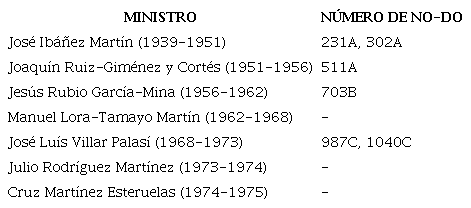 En cualquier caso, la cuestión es que, si en los primeros años el autoritarismo era mucho más explícito en las pantallas de cine, después quedó más bien difuso con otras noticias de una apariencia menos beligerante políticamente, a pesar de que el general Franco siempre defendió que los militares tenían que participar activamente en la vida política (DE RIQUER, 2010). Buena prueba de esto es el Cuadro 2, que a continuación se adjunta, porque queda confirmada la presencia de los ministros en las noticias sobre la Universidad de Barcelona:
