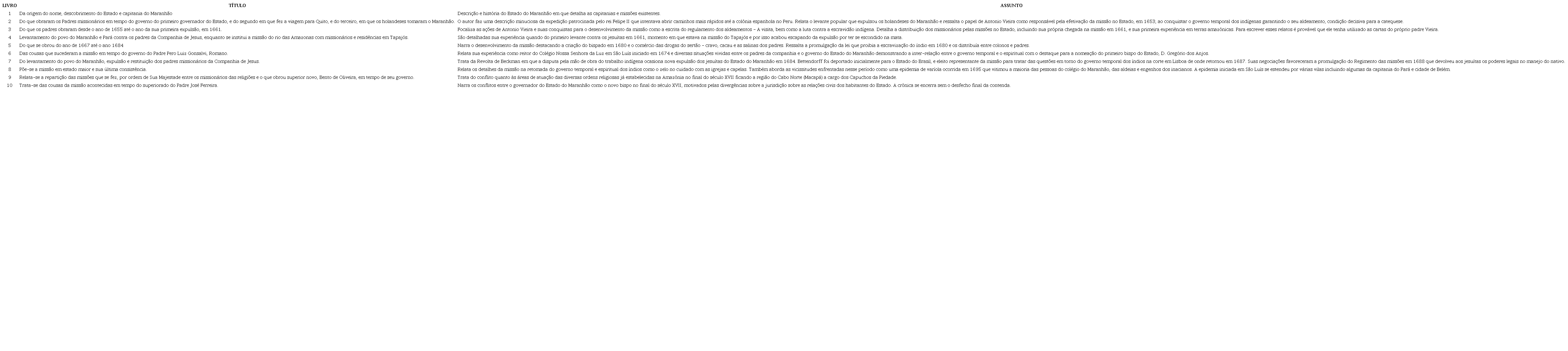 A cópia manuscrita da crônica se encontra no setor de obras raras da biblioteca da Universidade de São Paulo (Coleção Yan Almeida Prado). A primeira publicação foi realizada em 1910 na Revista do Instituto Histórico Geográfico Brasileiro e, em 1990, a Secult/PA a reimprimiu (ARENZ, 2010). Esta versão contém seiscentas e noventa e sete páginas e está dividida em dez livros sem um rigor cronológico, pois o autor retoma, em vários momentos, acontecimentos de épocas anteriores. O Quadro 1 a seguir resume os temas abordados em cada um desses livros: