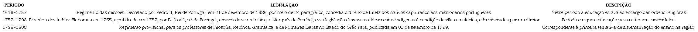 Silva (1976) considera que a educação na Amazônia Colonial pode ser dividia em três grandes períodos, baseadas em três importantes legislações (Quadro 2):