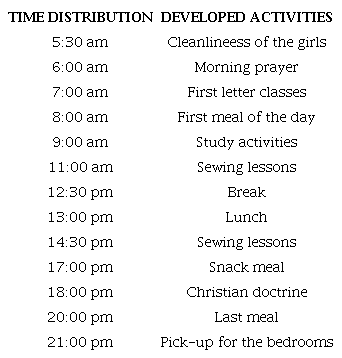 For the disciplinary apparatus have a feature, it was necessary that the temporal occupation of the activities of the girls made distributed in an annulling way “everything that can disturb and distract, it is about constituting an integrally useful time” (FOUCAULT, 2004, p. 118), even for those underage. Regulation of the time that began in the early hours of the morning and ended at night, as shown in the table below.