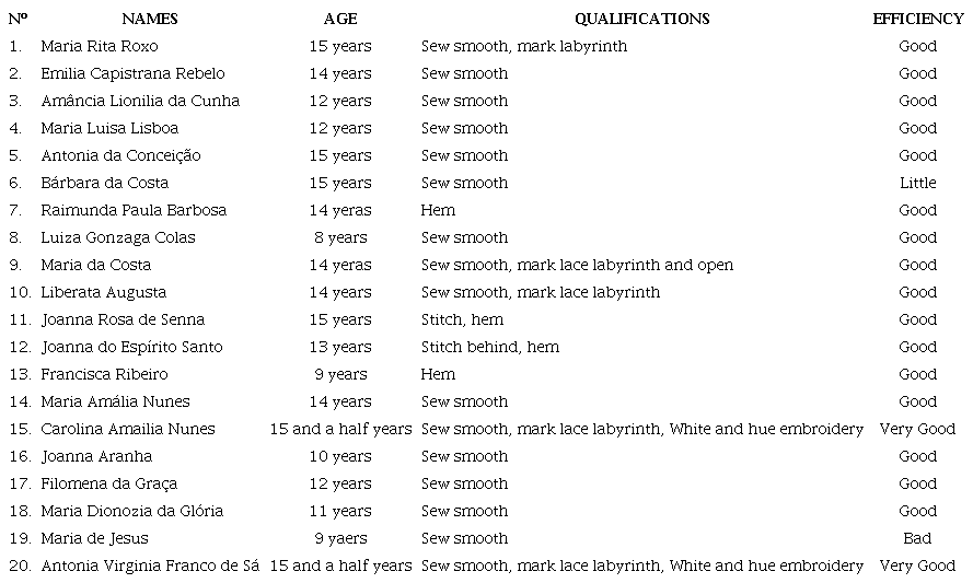 The teaching of needle arts, in the Santa Teresa Asylum, was under the responsibility of Maria Amália Ferreira, a single lady over thirty years old, and with her resignation, it fell to Eulina Roza de Araújo Gomes; the sewing classes taught by Arsênia Augusta Carneiro Belfort and her assistant, student Maria Victoria da Costa, and the first letters classes were taught by Marcellina Rosa Correia Leitão, with the help of Anna Rosa da Silva Nava. The choice of auxiliaries was due to the level of learning demonstrated in theoretical and practical classes presented before an examining board composed of teachers from the Asylum and guests from other schools, in which the level of achievement in the classes of first letters, embroidery, sewing was evaluated and Christian doctrine.