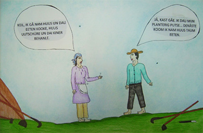 Tal comportamento é ressaltado na fala do marido (Fig. 3), quando a mulher é autorizada a ir para casa cuidar de tarefas domésticas. A manutenção dessa fala na educação escolar reproduz a desigualdade das relações de gênero e, ao mesmo tempo, mantém a imagem que os descendentes de pomerano têm do pai e do marido, reafirmando essa prática cultural e simbólica na localidade.