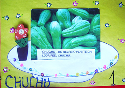O chuchu, produzido em diversas regiões da localidade, em especial em São Sebastião do Recreio6, é apresentado no contexto educacional como um cultivo importante, até porque a plantação de chuchu é considerada um lugar propício para jogar os cacos do ritual do quebra-louças no casamento pomerano7. Nesse rito, na sexta-feira, véspera do casamento, reúnem-se as famílias dos noivos e convidados para comer, dançar e quebrar louças. Conforme a tradição, os cacos devem ser enterrados na plantação - local onde o casal produz em parceria o alimento, com a finalidade de trazer sorte e espantar os maus espíritos. Constitui-se, assim, uma vinculação que se forma entre a terra, a produção e o simbólico.
