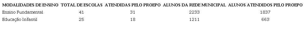 Santa Maria de Jetibá contava em 2012 com 49 escolas vinculadas ao Proepo, do total de 66 implantadas no município. Dos 3.444 alunos matriculados na rede municipal no período, 2.500 eram atendidos pelo programa (SECEDU, 2012). A tabela 1, a seguir, apresenta os dados das modalidades de ensino: