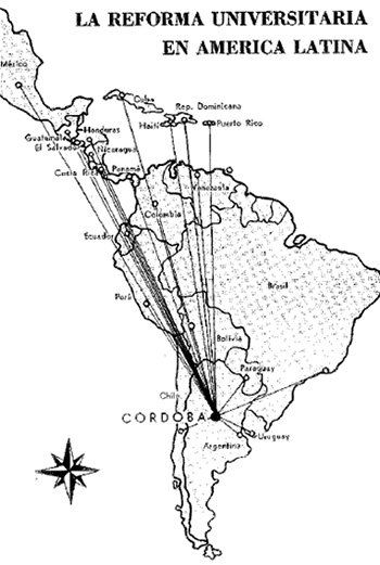 The 1918 University Reform, which took place in the city of Córdoba, Argentina, was one of the most important episodes of the 20th century with regard to higher education in Latin America. It founded a student movement engaged with the problems that affected the university at that time, linked mainly to the elitist, scholastic and ecclesiastical nature of teaching, assuming that these issues were common to Latin American universities. From Córdoba, a seed was sown, whose fruits were also reaped in other countries, where there was favorable ground for the organization of a student movement willing to transform the conservative standards that surrounded the university and society too. The protagonists of this process began to circulate in several Latin American countries to disseminate their ideas, to exchange proposals, as well as to search for support and establish partnerships. In this way, the meaning of the Reform spread across the continent, impacting the organization of the student movement, the structures of university systems and society in general.