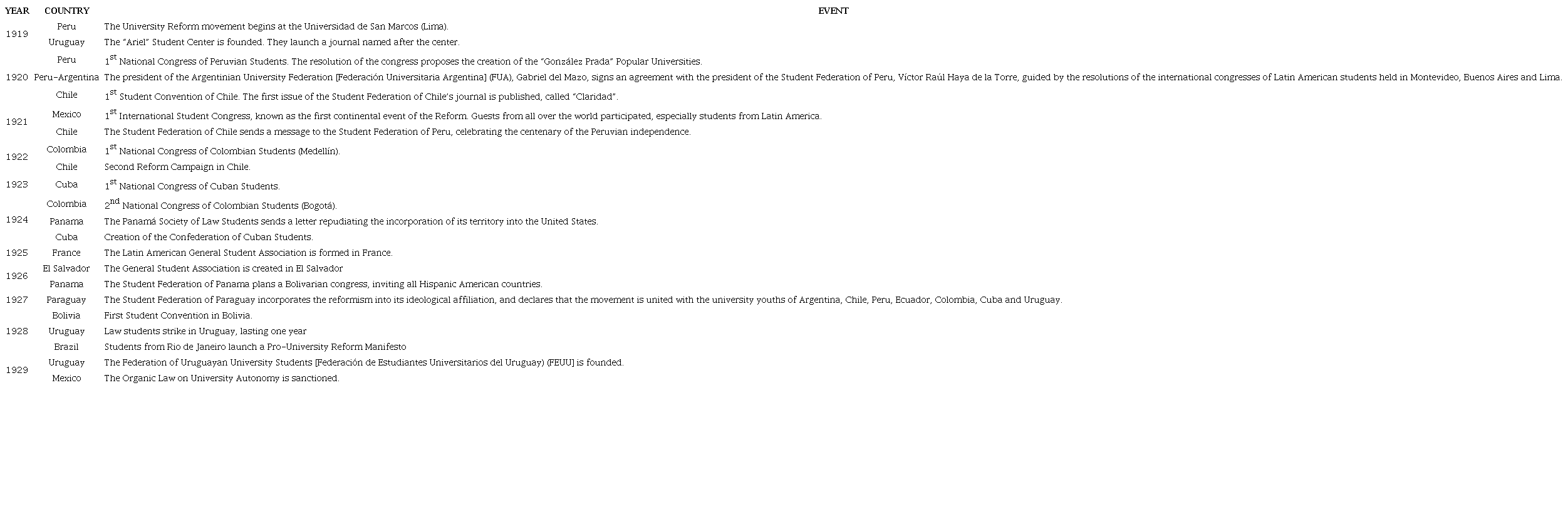 As shown in table 1, the news of the Córdoba Reform spread and the call from the students of Córdoba to Latin American youth did not take long to be answered in other countries of the continent, mainly in Peru, Uruguay, Chile, Mexico, Colombia and Cuba.