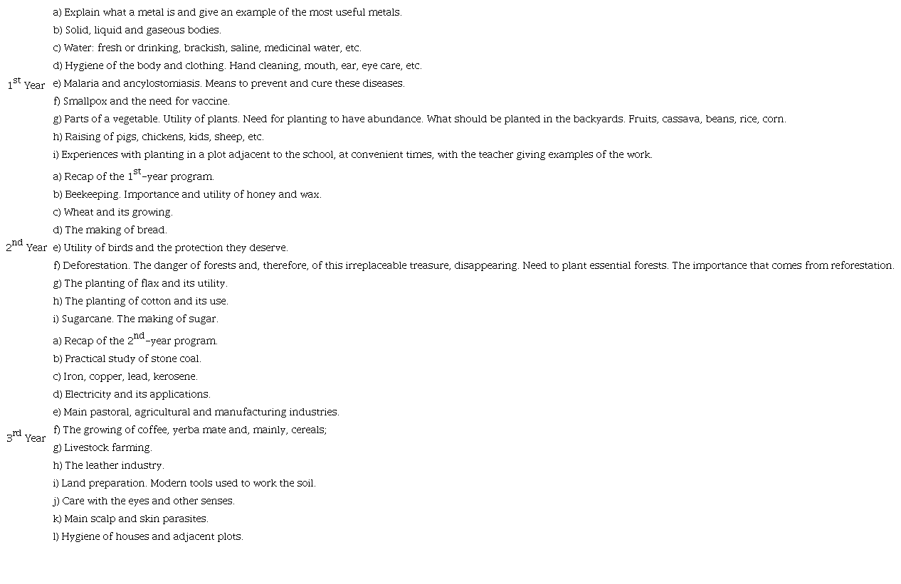 At the beginning of the 1920s, the teaching of scientific content took on an even more utilitarian sense. When curriculum definitions split the primary-schooling system of the state into a program for isolated schools and another one for school groups, the principle of utility was mobilized in the definition of the array of knowledge capable of adapting the teaching of this subject to the environment where the school was inserted. This aspect was even more striking for the program proposed for isolated schools. For said schools, which, through curriculum definitions, were associated with the rural environment, the proposed program indicated the following set of topics to be taught.
