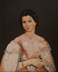 A importância dos eventos sociais e as diferenças nos trajes utilizados pelas mulheres dessa camada social aparecem na fig. 2, no retrato de Rita Loyola Marques. Nesse retrato visualizamos um modelo difundido entre os periódicos femininos da época e que deveria ser utilizado em festas, pois, deixava braços e ombros à mostra, além de afunilar bem a cintura. Mesmo o vestido deixando parte de seu corpo à mostra, o colar com pingente em formato de cruz deixa ao alcance dos olhos a devoção religiosa. O penteado, muito similar ao de Damiana Corrêa, deixa o brinco visível. Entre as joias, uma pulseira e um colar, na mão direita ainda segura um leque ornamentado.