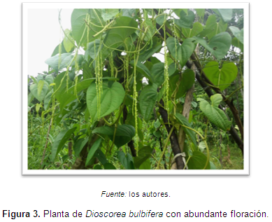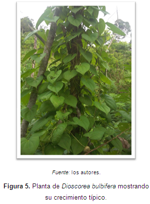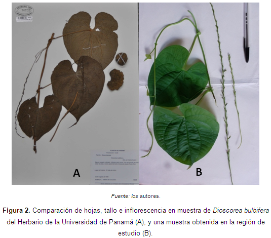 Para esta descripción se tomaron como referencias el Manual de Plantas de Costa Rica (2012) y la información contenida en la página web del Herbario de la Universidad de Panamá (2012), incluyendo la observación directa y captura de imágenes de la muestra No. 70722, correspondiente a D. bulbifera de dicho herbario. A partir de estas fuentes se puede afirmar que los especímenes observados en la región de estudio corresponden en términos generales a las características de la especie Dioscorea bulbifera L. (ver Figura 2).