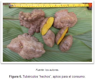 No hay precisión del momento de la cosecha, pero la señal más evidente de ello es cuando la planta (el bejuco) se comienza a secar y comienzan a desprenderse los tubérculos. Otro indicador es el color de los tubérculos, que pierden la coloración verdosa y grisácea para pasar a ser más chocolate oscuro. La pulpa (almidón) adquiere una coloración amarillenta. Algunos entrevistados sugieren que se puede comer antes, cuando ya alcanzaron cierto tamaño (ver Figura 6). Esta etapa la describen diciendo que la papa "está de verdura", lo cual a su vez plantea una cosecha escalonada de los tubérculos ya a partir de los 6 meses de sembrada. Al respecto Pérez et al. (2005) anotan que en Cuba los campesinos recogen la cosecha en noviembre, diciembre o enero, y se siembra en el mes de abril.