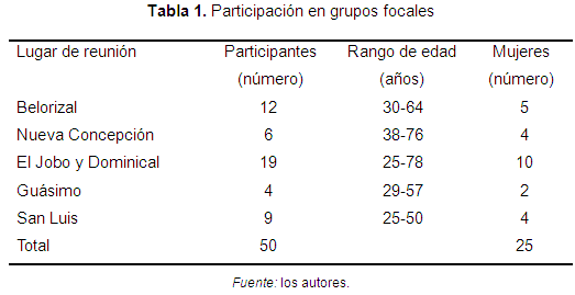 Además de los moradores de las comunidades ejes, se contó con la participación de agricultores de comunidades vecinas, tales como La Mina, Santa Rosa, Santa Lucía, Villa del Carmen, Miguelito, Valle de Escobal y Santa Elena, entre otras. En la Tabla 1 se cuantifica la participación en estas jornadas.