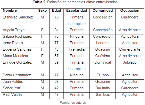 Para complementar la información obtenida en estos grupos focales, se realizaron recorridos de campo y entrevistas a personajes clave identificados en las comunidades, básicamente ancianos, curanderos y personas que manejan el cultivo en estudio. El cuestionario semiestructurado utilizado, contenía también los mismos temas abordados en los grupos focales. En la Tabla 2 se presentan las características generales de los entrevistados.