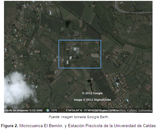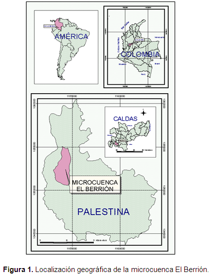 El trabajo se desarrolló en la Estación Piscícola de la Universidad de Caldas, localizada en la microcuenca del caño El Berrión, veredas Los Lobos y Santágueda, municipio de Palestina (Caldas, Colombia), coordenadas: Longitud W 75_45' - Latitud N 5_04') (Figura 1). En la Figura 2 se observa parte de la microcuenca El Berrión y la Estación Piscícola. La microcuenca presenta elevaciones entre los 1000 y 1400 msnm. Posee 541,3 ha, hace parte de la microcuenca de la quebrada Carminales, y esta a su vez de la cuenca del río Chinchiná (Cauca-Caribe) la cual superó el 10% de la presión sobre su recurso hídrico a partir del año 2008 (Grajales, 2004; CORPOCALDAS, 2007).