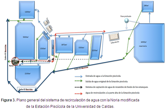 La optimización en el uso del recurso hídrico de la Estación Piscícola de la Universidad de Caldas obligó a buscar estrategias que permitieran la sostenibilidad de la misma. Es así como se opta por recircular (reutilizar) el agua como una alternativa viable para la estación, adaptando un mecanismo ancestral como es la rueda hidráulica o Noria. El nombre proviene posiblemente de la palabra árabe noria (na'oura) (Al-Dbiyat, 2009), saqiya (en árabe "el irrigador") (Mays, 2010a), na'ura (en árabe "ruidoso") y noriya (en árabe "ladrón, que roba el agua") en Israel, Transjordania y Siria: rueda persa; en Irán, India y Pakistán: rueda de accionamiento hidráulico (Ayalon, Milo y Nes, 2000).