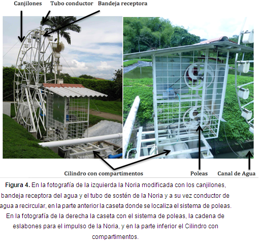 La Noria modificada está localizada al final de un canal de desagüe, donde se recoge el agua de recambio de tres baterías de estanques que desaguan directamente, y el agua de cuatro baterías de estanques que caen previamente en el Cilindro con compartimentos para generar movimiento con las poleas (Figura 3). La Noria es una estructura circular de 7 m de diámetro, construido de forma modular con ángulos de hierro ajustados entre sí con tornillería, adaptada con 32 canjilones construidos en fibra de vidrio, cada uno con una capacidad de 5 L, los cuales recolectan el agua cuando están en la parte inferior de la Noria, tomando únicamente la parte superficial del agua de la canal, evitando captar sedimentos; es llevado posteriormente el agua a la parte superior de la Noria donde los canjilones se desocupan y depositan el agua en la bandeja receptora, comenzando así la recirculación con un promedio de 1,5 L/seg de agua, esta es conducida inicialmente por un tubo galvanizado, que a su vez sirve de soporte de la Noria (Figura 4), a continuación es transportada por gravedad hasta la parte superior del canal principal de abastecimiento de agua de la Estación a la altura del Laboratorio Ictiológico, completándose así el ciclo.